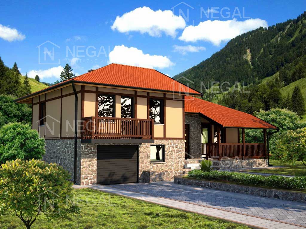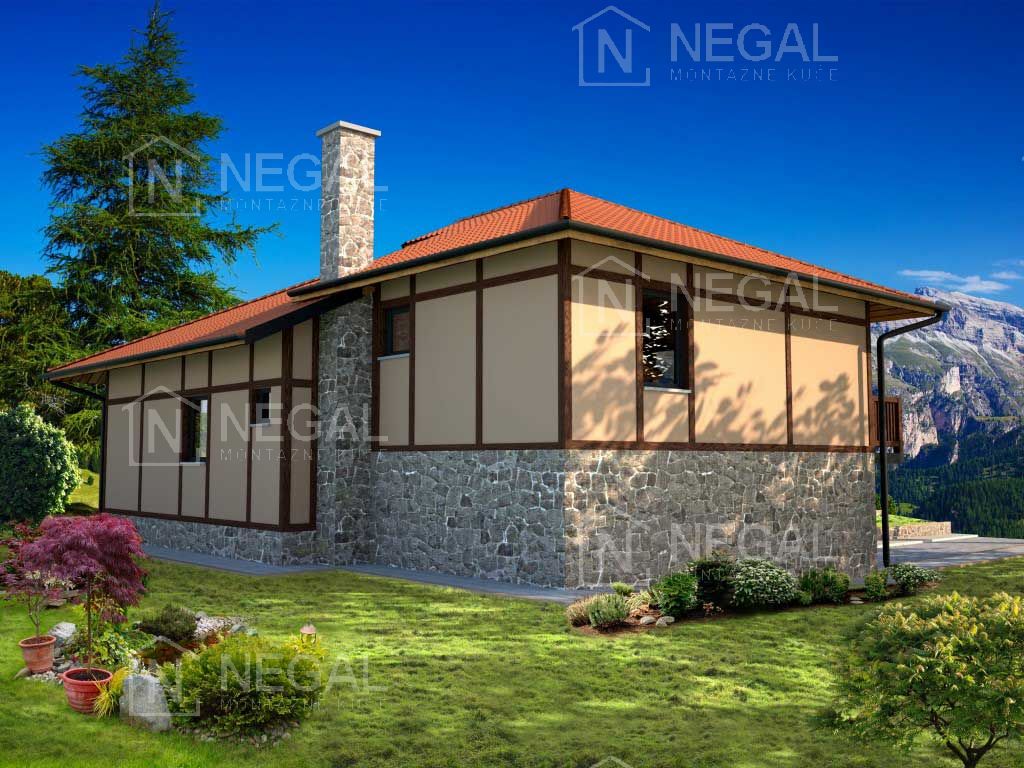 Montažna NEGAL stambena kuća iz kategorije Klasik. Komforna porodična kuća za porodice sa troje ili četvoro dece. Odlična kompozicija prostorija koje su podeljene u dve veoma funkcionalne celine. Jedna celina koja je denivelacijom podignuta u odnosu na drugu za sedam stepenika čini tri veoma komforne sobe i komfornim kupatilom. Međusobnu komunikaciju ostvaruju preko hodnika koji je samom organizacijom prostora sveden na minimum. Jedna soba koja ima pogled na prednji deo kuće ima direktan izlaz na balkon preko balkonskih vrata. Drugu celinu čini prostran dnevni boravak sa trpezarijom. Ima direktan izlaz na komfornu terasu koja sa ulaznim tremom čini jednu celinu. Kuhinja je fizički odvojena od dnevnog boravka i poseduje ostavinski prostor za odlaganje kuhinjskog inventara. U ovoj celini se nalazi i zaseban WC. Sobe se nalaze iznad garaže pored koje postoje i podrumske prostorije za odlaganje baštenskog alata i prateće opreme Vašeg automobila. Ostvaren je i direktan pristup iz garaže do unutrašnjeg dela kuće preko stepeništa.