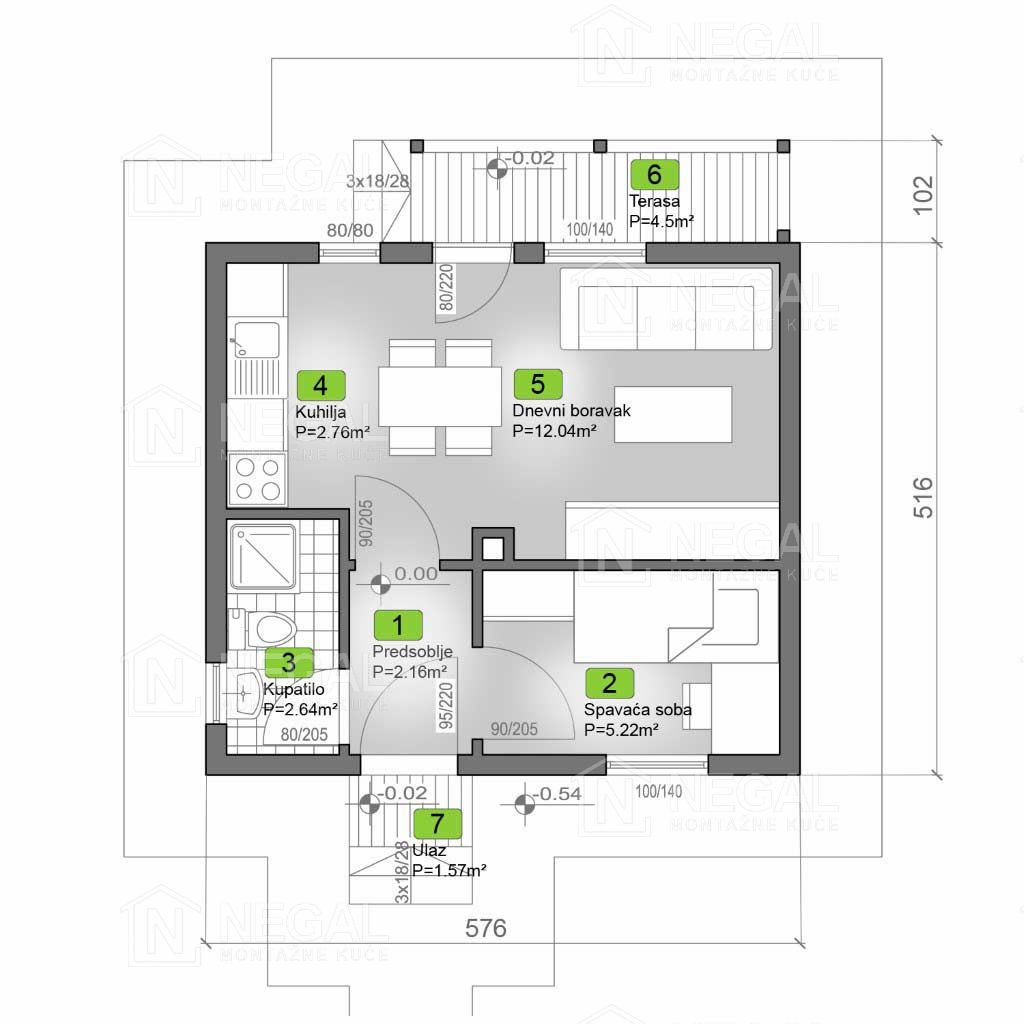 Dnevni boravak je direktno povezan sa terasom gde se nalaze dva prozora i balkonska vrata koji dozvoljavaju dosta dnevnog svetla i sunca unutar njega. Trpezarijski sto se nalazi blizu balkonskih vrata tako da možete ujedno uživati u omiljenom jelu i prirodi. Krov je jednostavan na dve vode uglavnom pokriven sa klasičnim crepom.