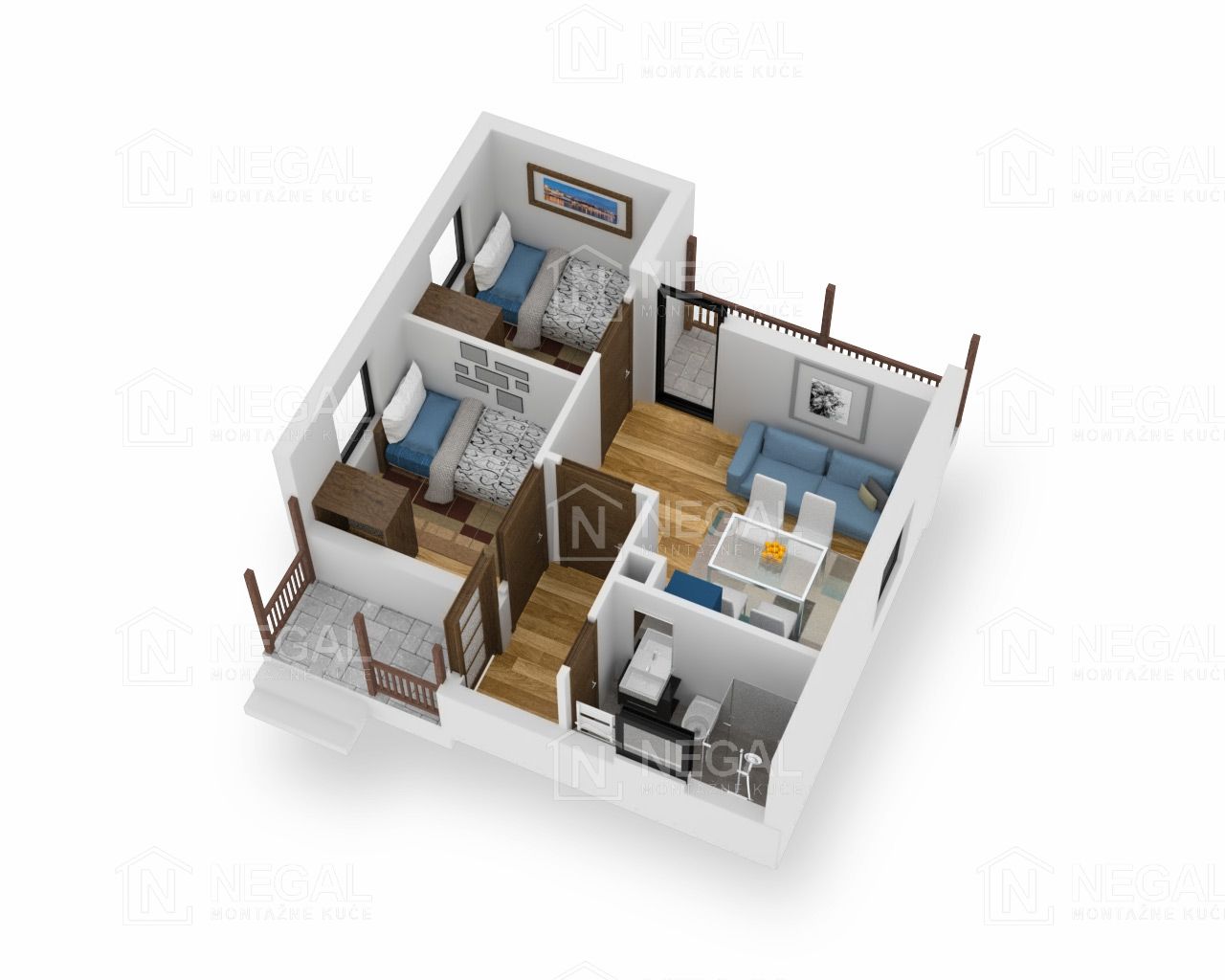 Ima dve sobe. Dnevni boravak i funkcionalo kupatilo sa tuš kabinom. Natkrivena tarasa omogućuje ugodan boravak na njoj i dok pada kiša.
