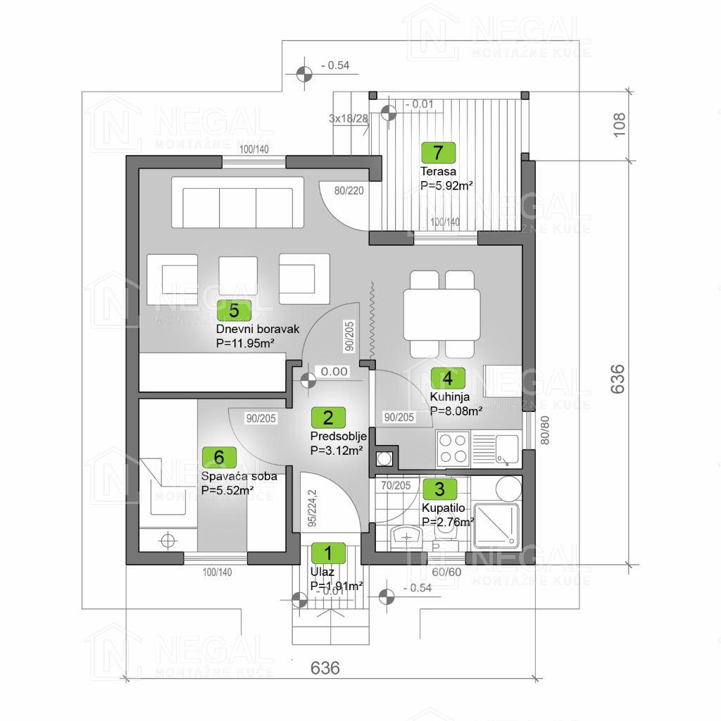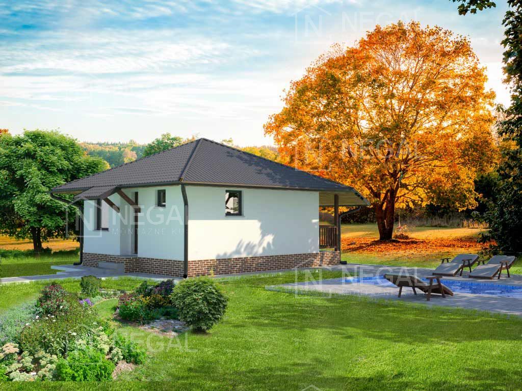 Dnevni boravak je paravanom ili kliznim vratima odvojen od trpezarije i kuhinje. Kupatilo je funkcionalno sa svim potrebnim elementima. Terasa je delom uklopljena u dnevni boravak pa imate osećaj zaštićenosti od spoljnih nepovoljnih uticaja a opet dovoljno velika za komforan boravak na njoj. Krov je na četiri vode pokriven crepom i idealno se slaže u okruženje.