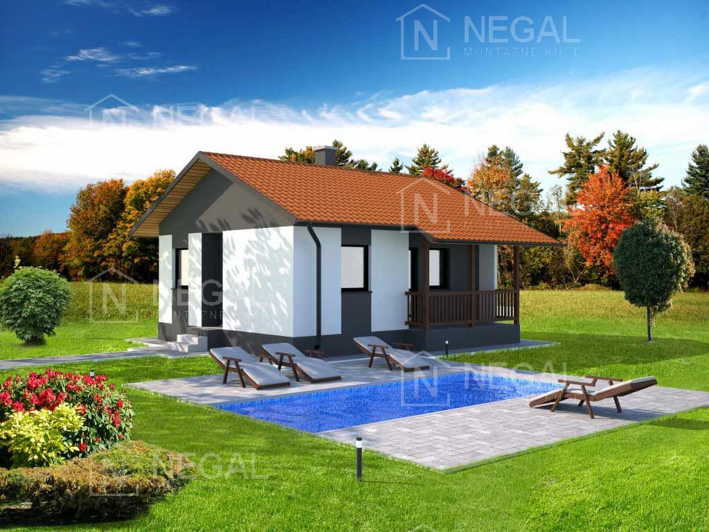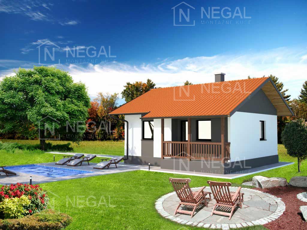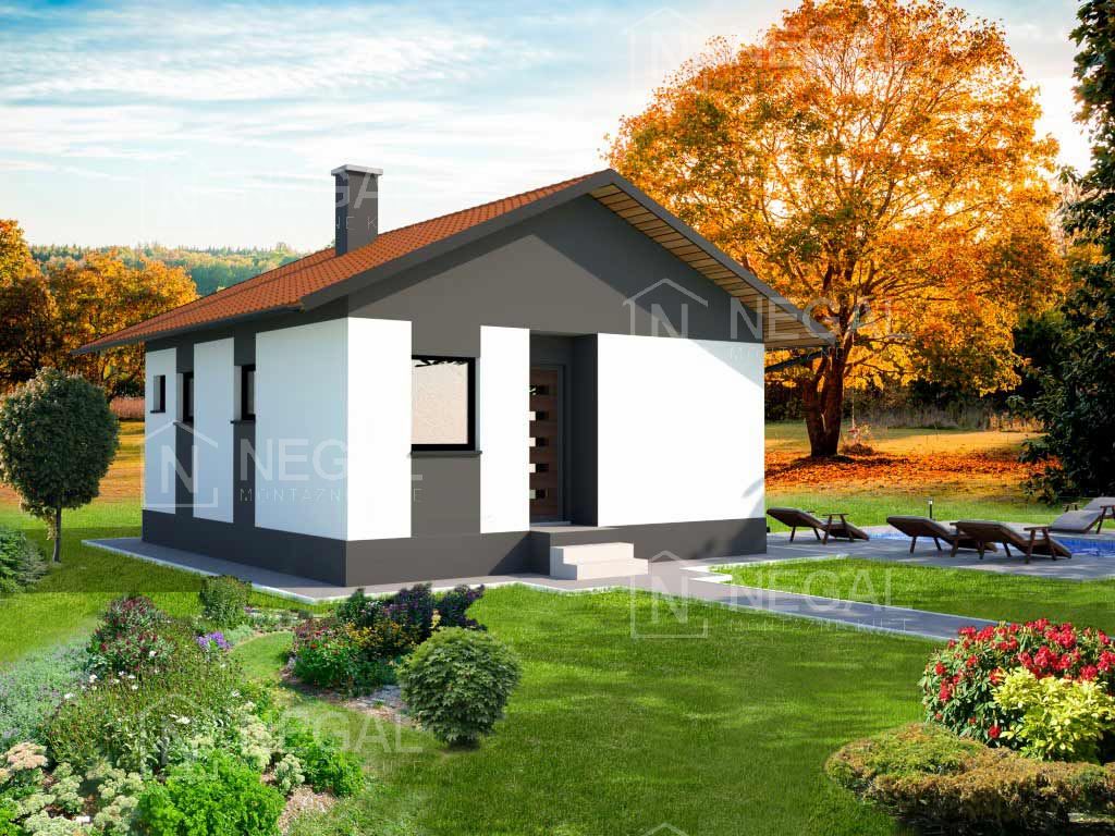 Montažna kuća iz kategorije Klasik. Idealna za stanovanje tročlane porodice jer ima sve potrebne funkcionalne celine a površinom ne zahteva prevelike troškove.