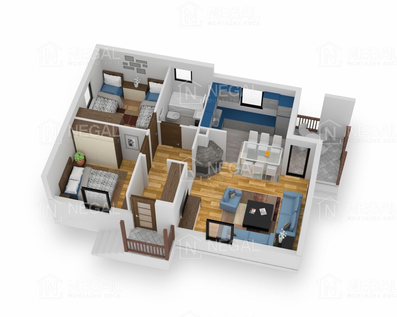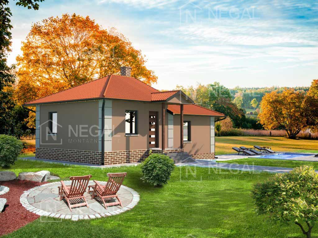Montažna kuća NEGAL iz kategorije Klasik. Jednostavne svedene forme za komforno stanovanje četvoročlane porodice. Funkcionalno je razdvojena gde su na jednoj strani dve komforne spavaće sobe sa kupatilom, a na drugoj dnevni boravak sa kuhinjom i trpezarijom. Kuhinjski prostor je dosta veliki pa se kuhinja može smestiti u “G“ orijentaciji. Jedna celina od druge je razdvojena hodnikom kao zajedničkom komunikacijom i sa dva stepenika koja prave denivelaciju nivoa a samim tim denivelišu i krov i daju posebnu arhitektonsku dinamiku objektu.
