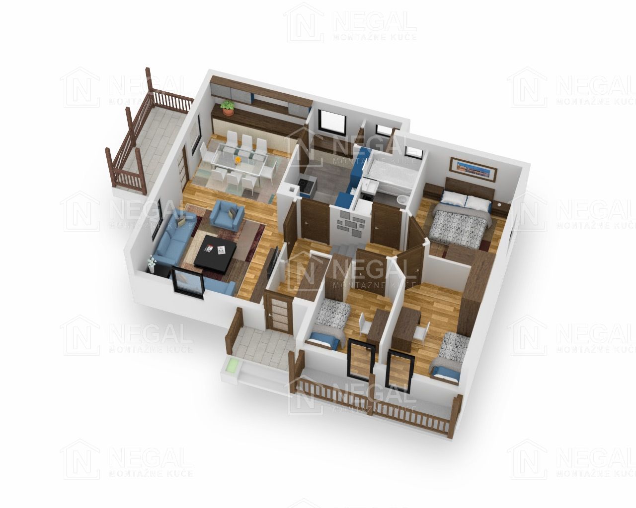 Kuća ima tri sobe od kojih su dve komfornije a jedna manja koja se može preurediti u radnu sobu. Kupatilo je na istoj etaži kao i sobe i ima direktnu vezu sa njima preko kratkog hodnika. Dnevni boravak je prostran i čini jednu celinu sa trpezarijom. Kuhinja je fizički odvojena od dnevnog boravka i trpezarije što omogućuje da potpuno uživate u pripremi Vaših omiljenih jela. Kuhinjski deo ima i ostavu za odlaganje kuhinjskog inventara. Dnevni boravak ima direktan izlaz na terasu. Terasa je preko stepenika spojena sa zadnjim delom dvorišta. Krov je na četiri vode i denivelisan zbog dva novoa prostorija. Pokrivka je crep u natur boji i u kombinaciji sa drvenim elementima i obradom sokle od kamena daje arhitekturi dinamičnu notu.