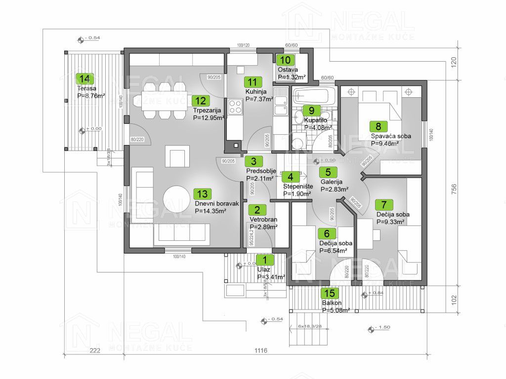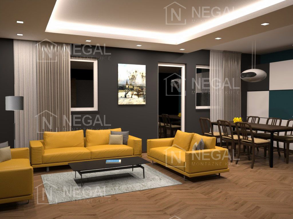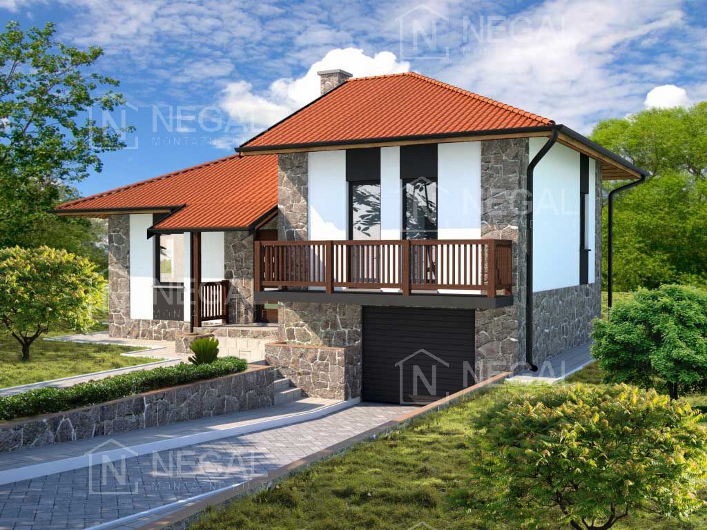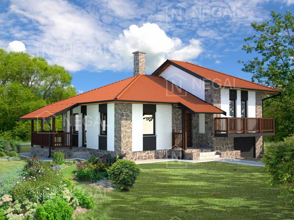 Montažna NEGAL stambena kuća iz kategorije Klasik. Dimenzije kuće su 13,38 m x 9,78 m. Odlična za porodice sa dvoje ili troje dece. Ima dve celine koje su denivelisane preko četiri stepenika. Prva celina se nalazi iznad garaže i podrumskih prostorija. Garaža ima mesta za parkiranje jednog vozila i prostorije za odlaganje neophodnog baštenskom alata i prateće opreme za Vaš automobil. Garažna vrata su segmentna koja se otvaraju pod plafon i pokreću pomoću elektromotora sa daljinskom upravljačem za komforan ulazak.