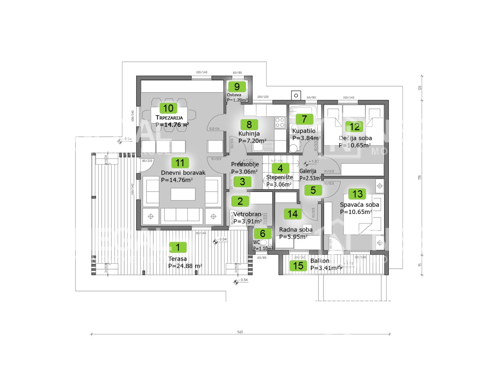 Porodična druženja se lako mogu iz objekta prebaciti na terasu ili dvorište. Terasa komplentno natkrivena sa drvenom opšivkom plafona i drvenim elementima pruža osećaj topline. Viši deo je organizovan sa spavaćim sobama. Dve veoma komforne sobe sa jednom dečijom imaju direktan pristup preko galerije hodnika ka kupatilu. Sobe imaju izlaz na balkon oivičen zidom i naglašen u beloj fasadi dajući mu ton elegancije. Antracit stolarija sa termoizvolvanim staklom daje poseban naglasak konturama otvora. Ispod višeg dela je garaža sa pomoćnim prostorijama i kotlarnicom koje i maju direktu vezu iz kuće za potpuni komfor.