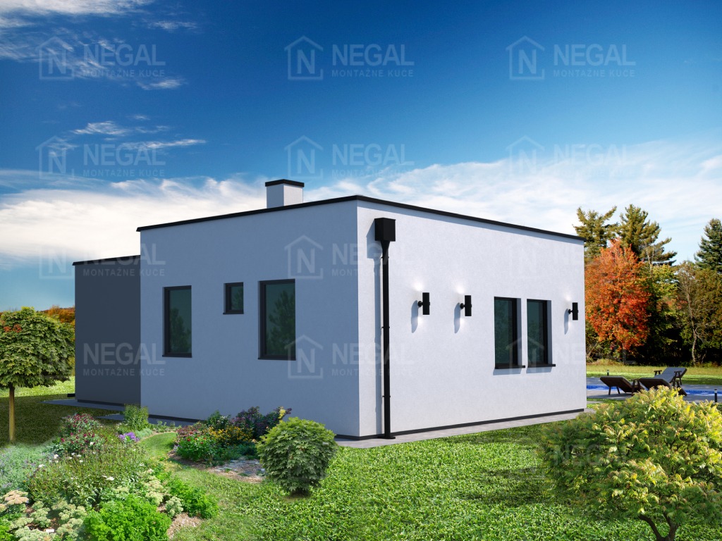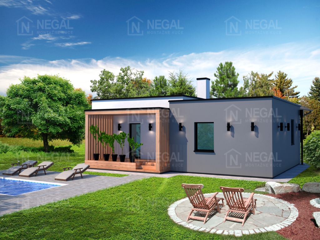 Montažna NEGAL stambena kuća iz kategorije modern. Savremena montažna kuća dizajnirana u modernom stilu sa ravnim krovom. Savremeni prvoklasni i ekološki materijali obezbeđuju niske troškove održavanja. Drvo, kao osnovni konstruktivni elemanat, naglašava ulazni deo i prestavlja spoj moderne arhitekture kuće i prirode.